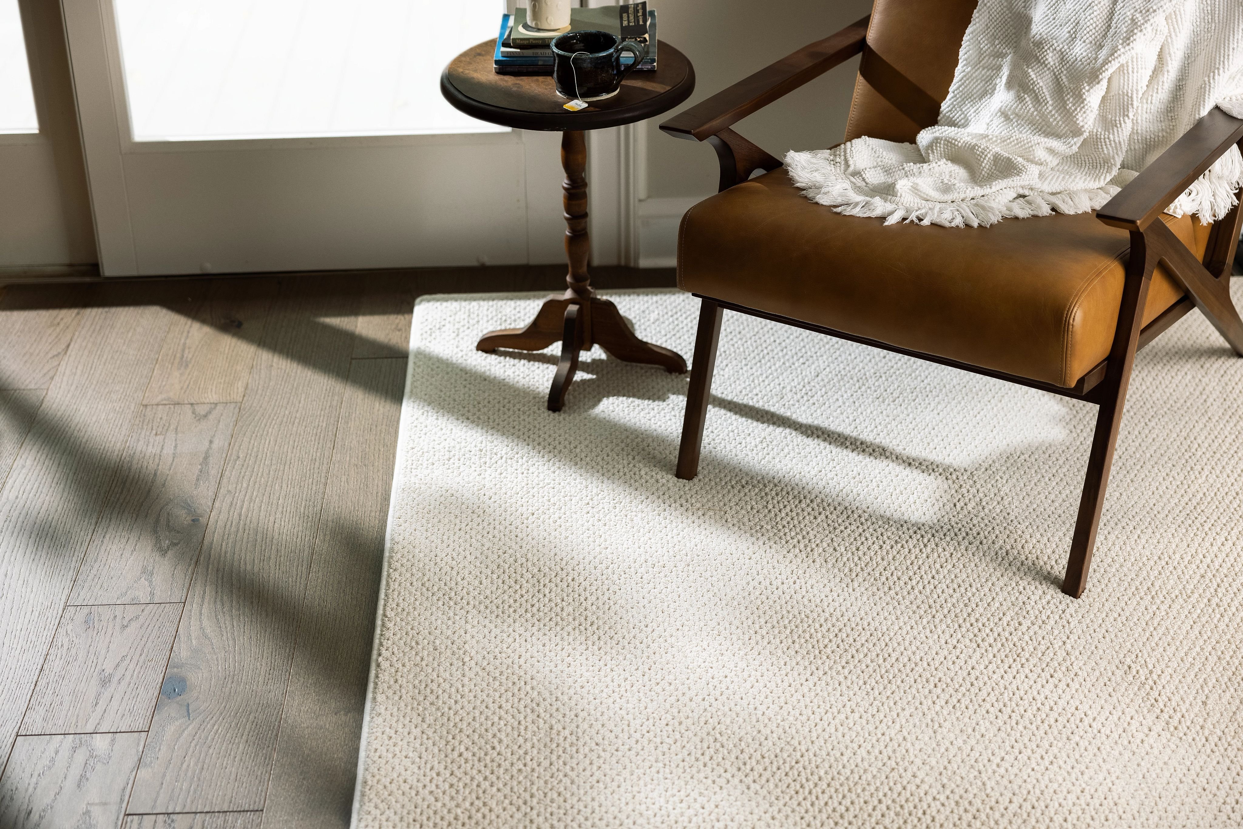 wood and leather chair on white area rug